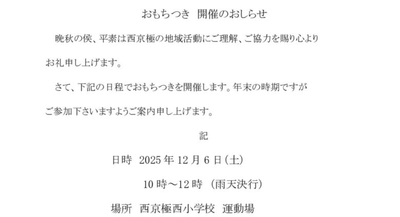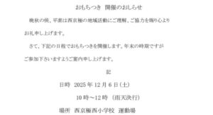 • 各種団体紹介 おもちつき, ふれあい実行委員会, 少年補導委員会, 西京極西小学校