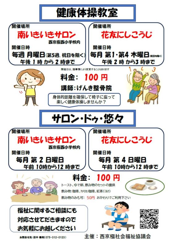 社会福祉協議会 健康体操教室, 南いきいきサロン, 花友にしこうじ, 西京極社会福祉協議会, 西京極西小学校 健康体操教室 2026年度 もっと見る nishikyogoku-jichiren 2026年4月13日
