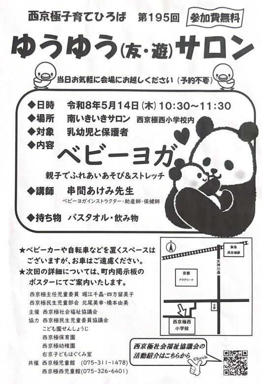 社会福祉協議会 こども園せんしょうじ, ゆうゆうサロン, 右京子どもはぐくみ室, 西京極保育園, 西京極児童館, 西京極幼稚園, 西京極民生児童委員協議会, 西京極社会福祉協議会, 西京極西児童館 西京極子育てひろば 第195回 ゆうゆう(友・遊)サロン 5/14 Thr. もっと見る nishikyogoku-jichiren 2026年4月13日
